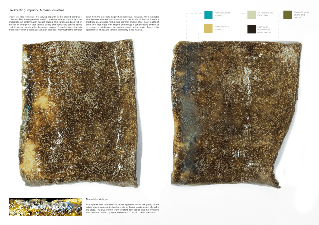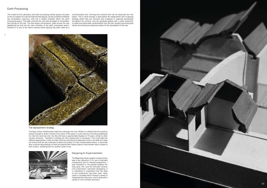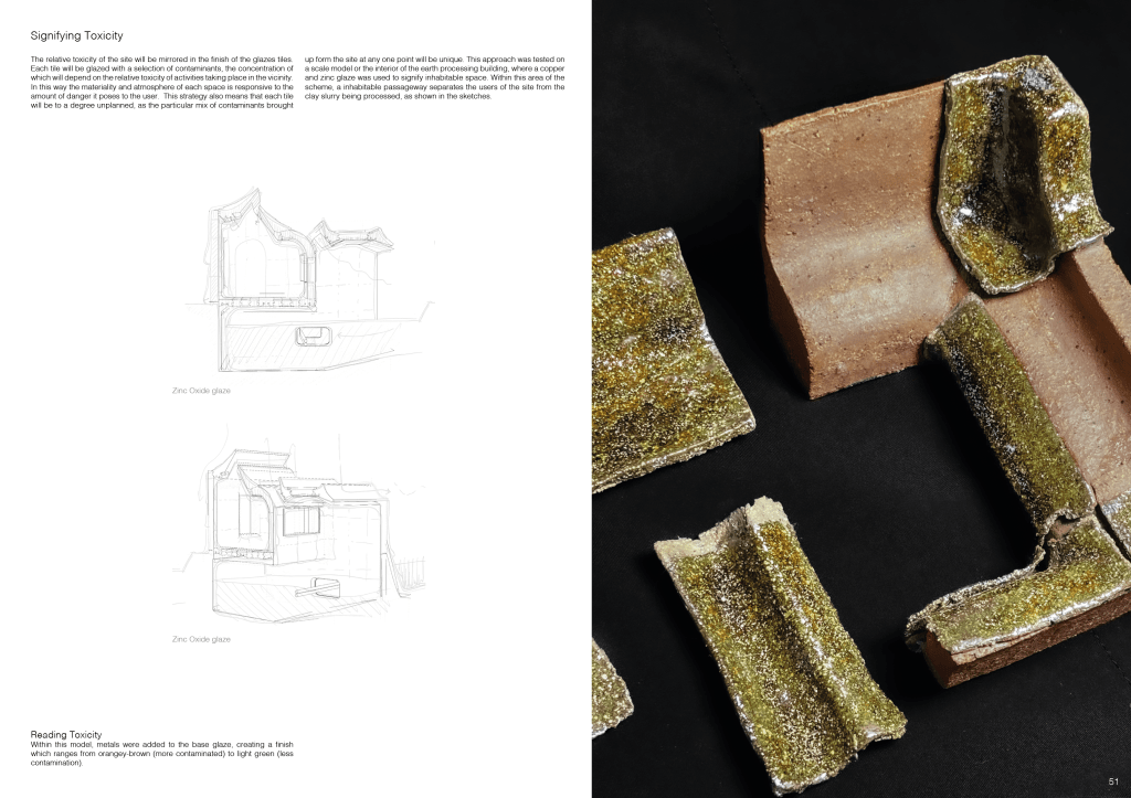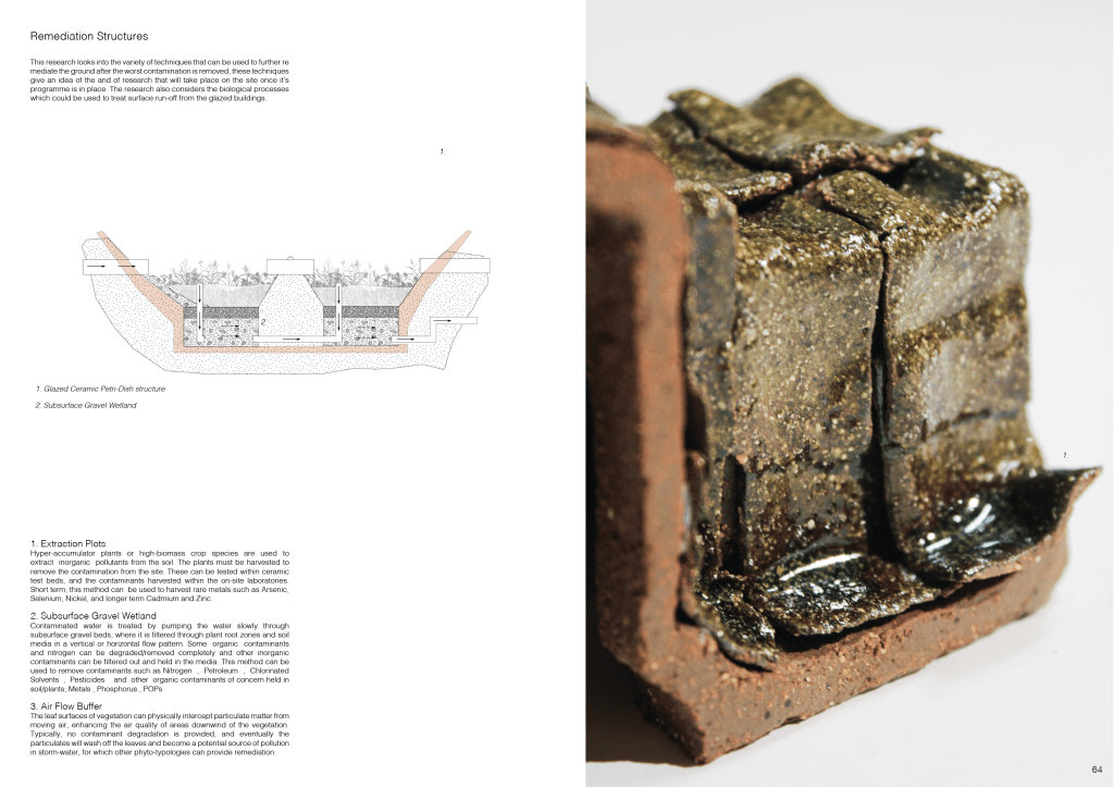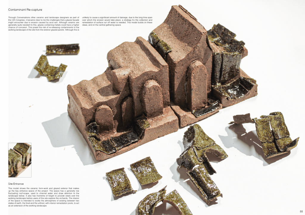 London’s manufacturing history has left behind a legacy of contaminated land and water, especially in the Lea Valley now its post-industrial brownfield land is being redeveloped. In response, this design research investigates the potential of clay-based site strategies to rethink the Lea Valley Filter Beds in an age of pollution and climate change. This theme is explored through site-specific ceramic prototypes, models and drawings which were created in liaison with the ‘Save Lea Marches’ pressure group. Tests were carried out into making ceramic glazes from locally foraged clay, applying this to design clay-brick structures within a new orchard landscape.